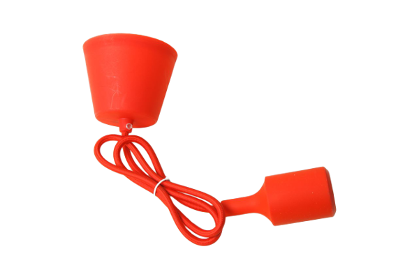 Lámpara colgante de cable con recubrimiento textil en color rojo. Florón plástico, cable textil y portalámparas con funda de silicona, todo a juego, del mismo color.