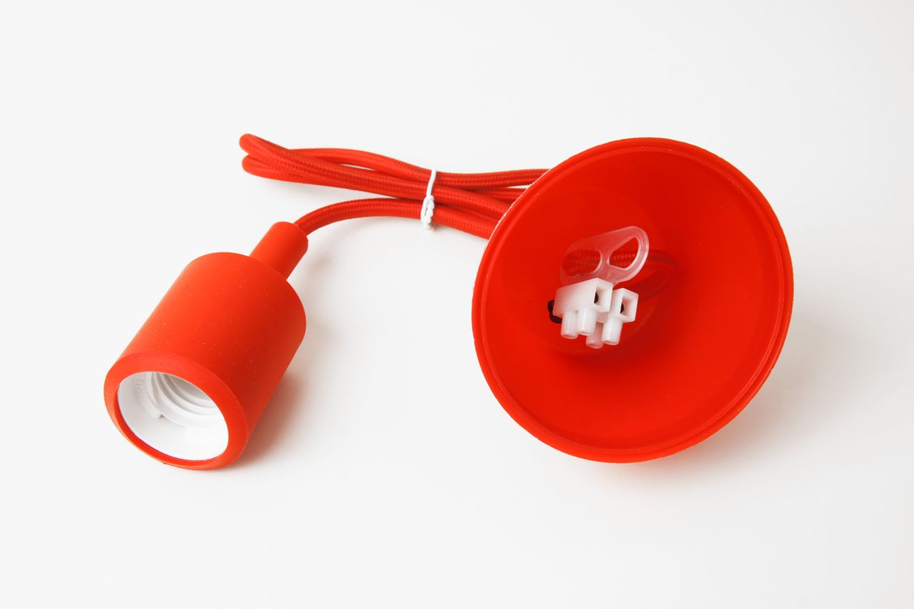 Lámpara colgante de cable con recubrimiento textil en color rojo. Florón plástico, cable textil y portalámparas con funda de silicona, todo a juego, del mismo color.