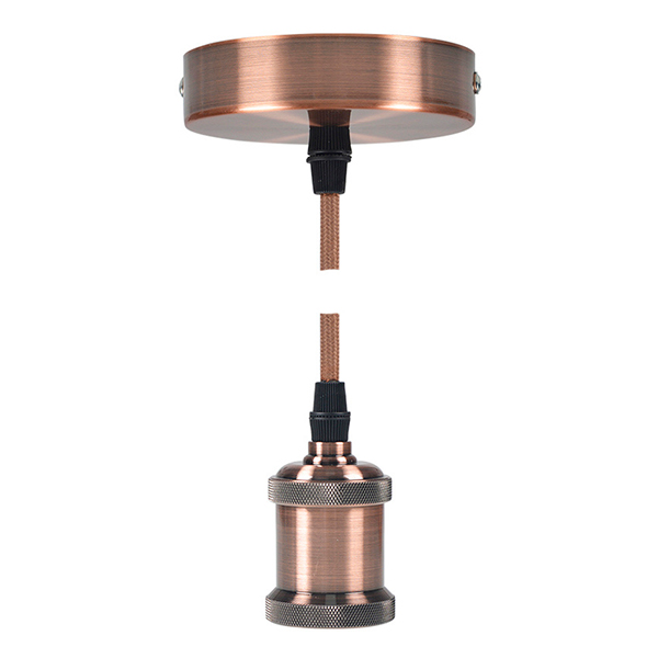 Lámpara colgante con portalámparas y florón de metal en acabado cobre. Cable tubular con recubrimiento textil de color cobre.