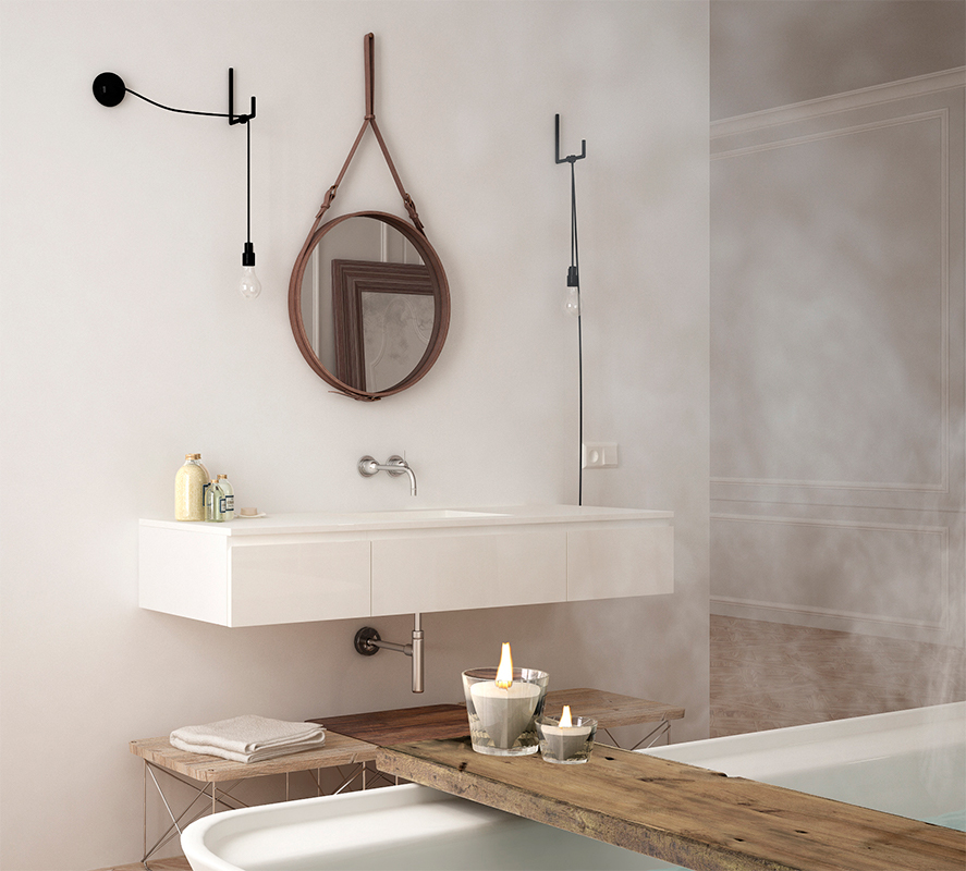 En la zona del espejo es donde necesitas más cantidad de luz. Es preferible repartir la luz a ambos lados del espejo. De esta forma se evitan sombras y reflejos. Se pueden usar apliques fijos en la pared con bombillas de led que permiten un encendido inmediato. Los apliques puedes buscarlos con acabados de latón (el latón natural nunca se picará), acabados de acero. cromo, en cobre o porcelana. Otra solución para esta zona son las linestras de led de 60cm ó 1m colocadas longitudinalmente a los lados del espejo. Dan una luz suave, cálida, y sin estridencias (esta opción sólo es aconsejable para los amantes de la luz cálida).