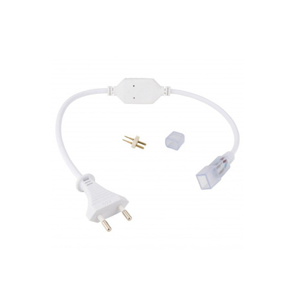 Por un lado conecta a la tira y en el otro extremo acaba en una clavija de enchufe.
