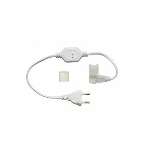 Por un lado conecta a la tira y en el otro extremo acaba en una clavija de enchufe.
