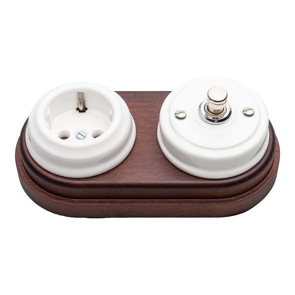 Conjunto de un interruptor de porcelana con botón metálico y un enchufe de porcelana sobre madera doble. La luz se enciende pulsando el botón. En esta composición resalta la madera que abraza todo el conjunto. Grupo de mecanismos muy habituales de los dormitorios. Conmutado y enchufe agrupado por una madera natural que le aporta al conjunto gran personalidad y fuerza.