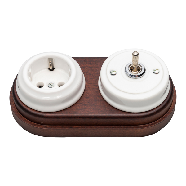 El trabajo de la madera torneada a mano hace resaltar la porcelana blanca, creando un grupo de conmutado y enchufe que no pasa desapercibido. Madera de haya barnizada en color castaño oscuro.