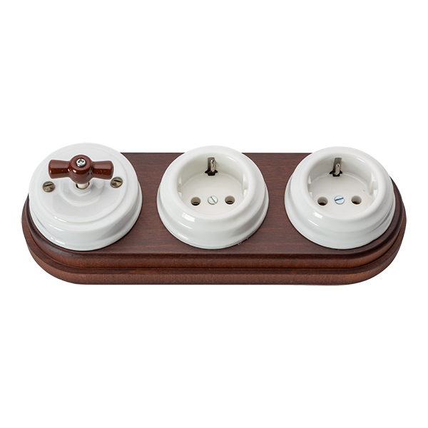 Conjunto de interruptor y dos enchufes de porcelana sobre madera triple. En esta composición resalta la madera que abraza todo el conjunto. Conmutador y enchufes agrupados por una madera natural que le aporta al conjunto gran personalidad y fuerza.