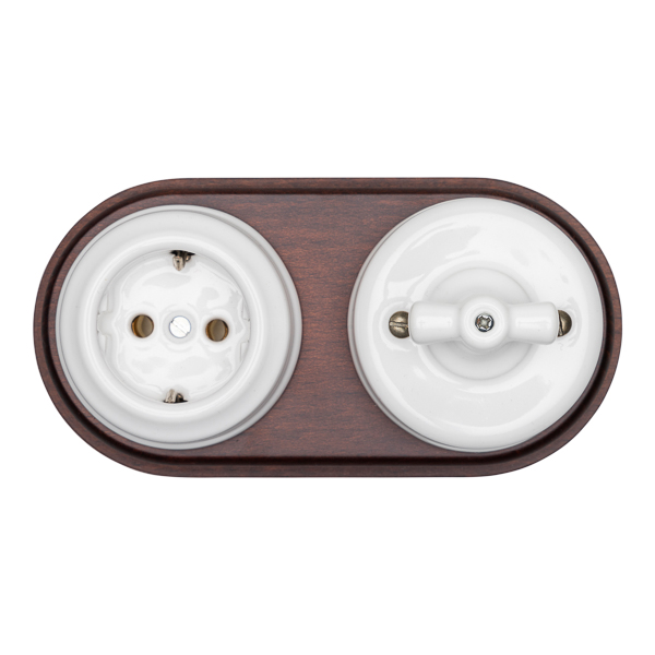 Conjunto de un interruptor y un enchufe de porcelana sobre madera doble. En esta composición resalta la madera que abraza todo el conjunto. Grupo de mecanismos muy habituales de los dormitorios. Conmutado y enchufe agrupado por una madera natural que le aporta al conjunto gran personalidad y fuerza.