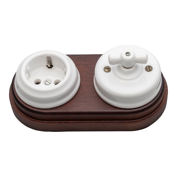 Conjunto de un interruptor y un enchufe de porcelana sobre madera doble. En esta composición resalta la madera que abraza todo el conjunto. Grupo de mecanismos muy habituales de los dormitorios. Conmutado y enchufe agrupado por una madera natural que le aporta al conjunto gran personalidad y fuerza.