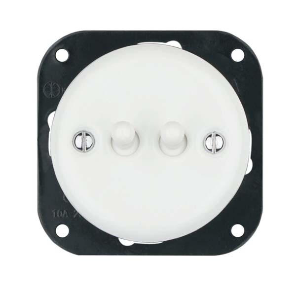 Doble interruptor conmutado de porcelana con dos palancas, para empotrar en cajetín universal (caja redonda o cuadrada).