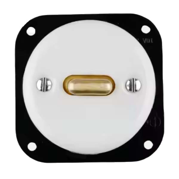 Interruptor conmutado de palanca fabricado en porcelana esmaltada blanca. La palanca es de plástico color dorada.