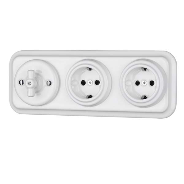 Conjunto formado por un interruptor conmutado y dos enchufes de porcelana agrupados en un marco triple de porcelana cuadrado.