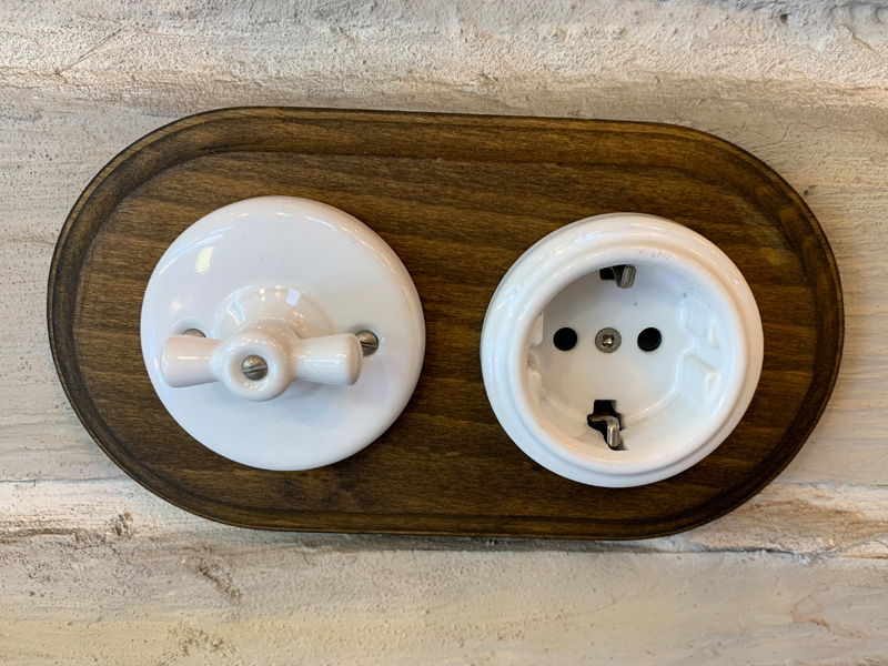 Incluye: interruptor de porcelana, enchufe de porcelana y marco doble de madera