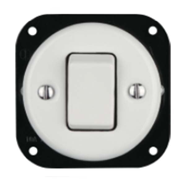 Interruptor, mecanismo de cruzamiento, con tecla basculante de porcelana blanca. Para empotrar en cajetín universal (caja redonda o cuadrada). Llaves de luz que evocan otra época, un lujo para la vista y el tacto.