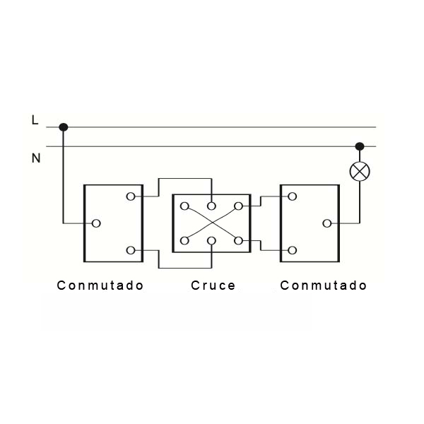 Su mecanismo de cruce permite encender y apagar un punto de luz desde tres sitios combinado con dos conmutadores. Consulte nuestro Blog: "¿interruptor, Conmutador o Cruzamiento?"