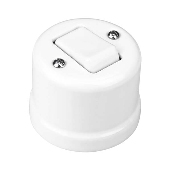 Interruptor, de mecanismo cruzamiento, con tecla basculante de porcelana blanca para instalación en superficie.