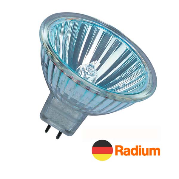 Bombilla dicroica halógena MR16 con un diámetro de 50mm (conocidas popularmente como “ojos de buey”). Alimentada a 12V mediante transformador. Casquillo bipin (GU5,3). Luz halógena (cálida) de 35W de consumo.
