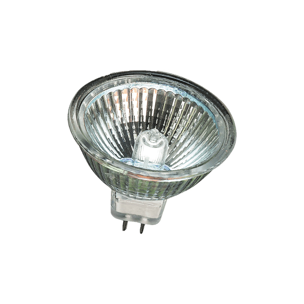 Bombilla dicroica halógena MR16 con un diámetro de 35mm (conocidas popularmente como “ojos de buey”). Alimentada a 12V mediante transformador. Casquillo bipin (GU4). Luz halógena (cálida) de 20W de consumo.