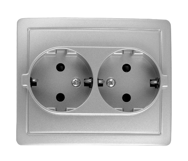 Doble base de enchufe con toma de tierra de color aluminio para instalación empotrada.