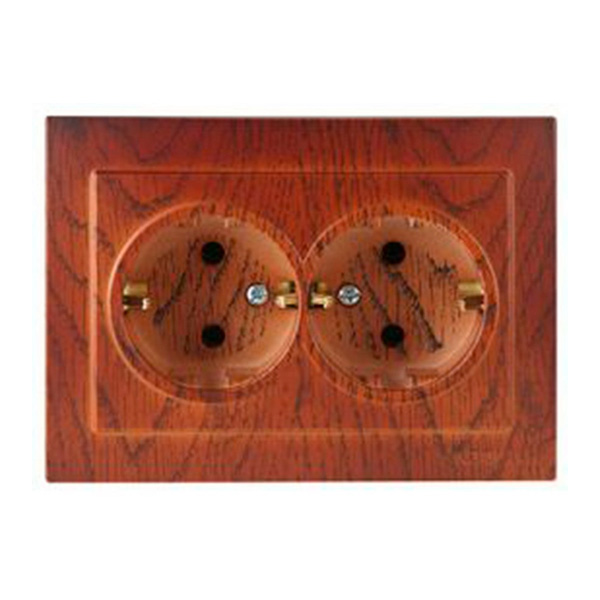 Mecanismo doble enchufe, en color madera acabado nogal. instalación empotrada. Utiliza un solo cajetín universal.