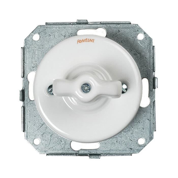 Doble interruptor rotativo fabricado en porcelana blanca para empotrar en cajetín universal (caja redonda o cuadrada). Llaves de luz que evocan otra época, un lujo para la vista y el tacto.