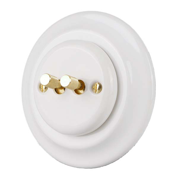 Doble interruptor conmutado con mecanismos de palanca metálica dorada y marco de porcelana blanca.