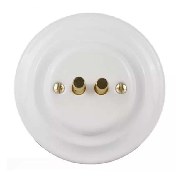 Doble interruptor conmutado con mecanismos de palanca metálica dorada y marco de porcelana blanca.