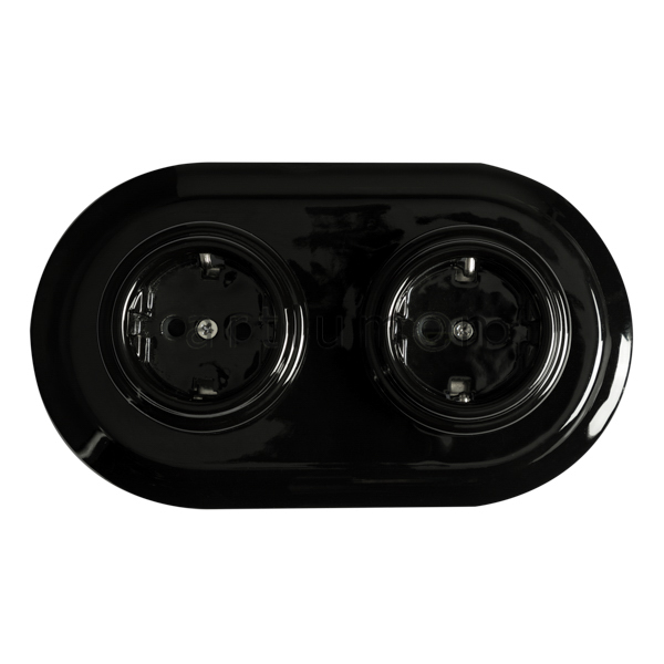 Conjunto formado por dos bases de enchufe fabricados en porcelana negra y marco doble también de porcelana negra. Para instalación empotrada