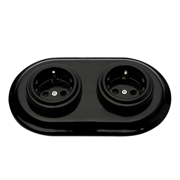 Conjunto formado por dos bases de enchufe fabricados en porcelana negra y marco doble también de porcelana negra. Para instalación empotrada