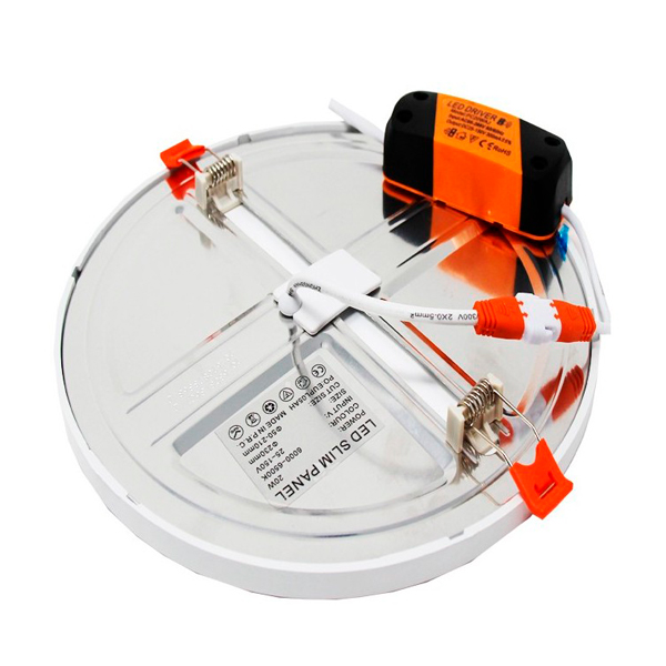 Downlight LED empotrable con muelles ajustables para poder adaptarse a diferentes tamaños de enclavamiento (se adapta a un taladro de mínimo 5cm a un máximo de 21cm). Redondo con marco de color blanco.