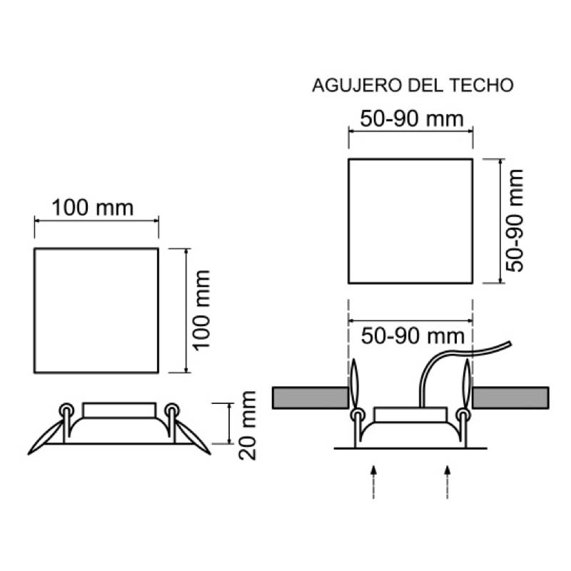 Downlight LED cuadrado empotrable. Con muelles ajustables para poder adaptarse a diferentes tamaños de enclavamiento (se adapta a un taladro de mínimo 5cm a un máximo de 9cm)