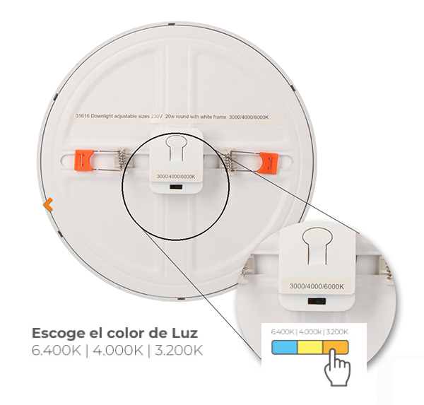 Downlight LED empotrable que permite escoger el color de la luz, se puede seleccionar color cálido (3200k), neutro (4000k) o frío (6400k). Sus muelles son ajustables para poder adaptarse a diferentes tamaños de enclavamiento (se adapta a un taladro de mínimo 6cm a un máximo de 17cm). Redondo con marco de color gris.