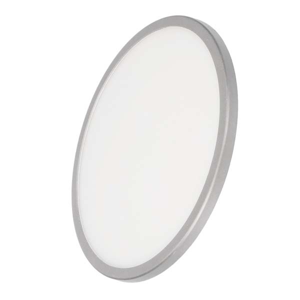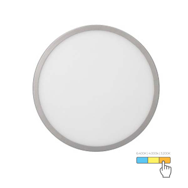 Downlight LED empotrable que permite escoger el color de la luz, se puede seleccionar color cálido (3200k), neutro (4000k) o frío (6400k). Sus muelles son ajustables para poder adaptarse a diferentes tamaños de enclavamiento (se adapta a un taladro de mínimo 6cm a un máximo de 17cm). Redondo con marco de color gris.