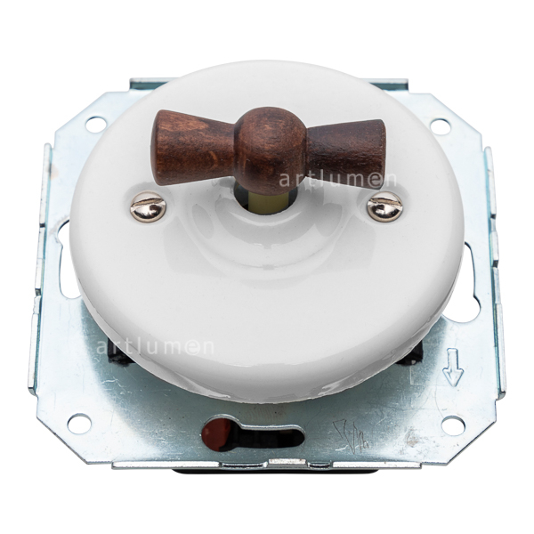 Interruptor de cruzamiento rotativo fabricado en porcelana blanca con lazo (maneta) de madera oscura. Para empotrar en cajetín universal (caja redonda o cuadrada). Llaves de luz que evocan otra época, un lujo para la vista y el tacto. Su mecanismo de cruce permite encender y apagar un punto de luz desde tres sitios combinado con dos conmutadores.