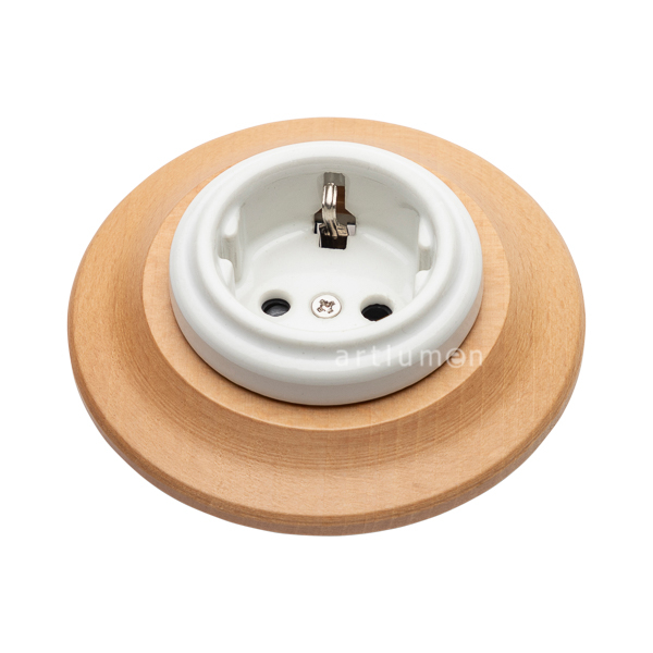 Base de enchufe fabricado en porcelana blanca con marco de madera clara para instalación empotrada. Mecanismos clásicos de porcelana sobre madera de haya con barniz acabado natural. Su estilo fresco se integra a la perfección en decoraciones de ambiente mediterráneo.