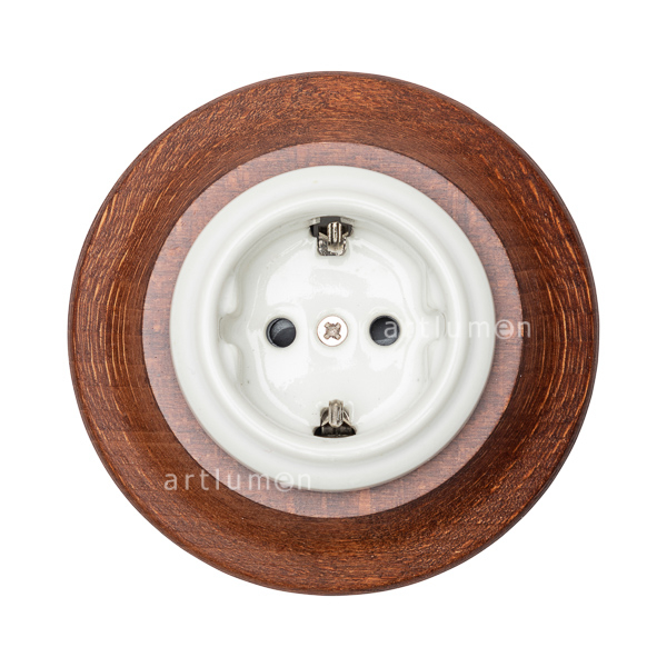 Base de enchufe fabricado en porcelana blanca con marco de madera oscura para instalación empotrada. Mecanismos clásicos de porcelana sobre madera de haya con barniz color castaño oscuro. Cuidados diseños que nos trasladan a ambientes rústicos.