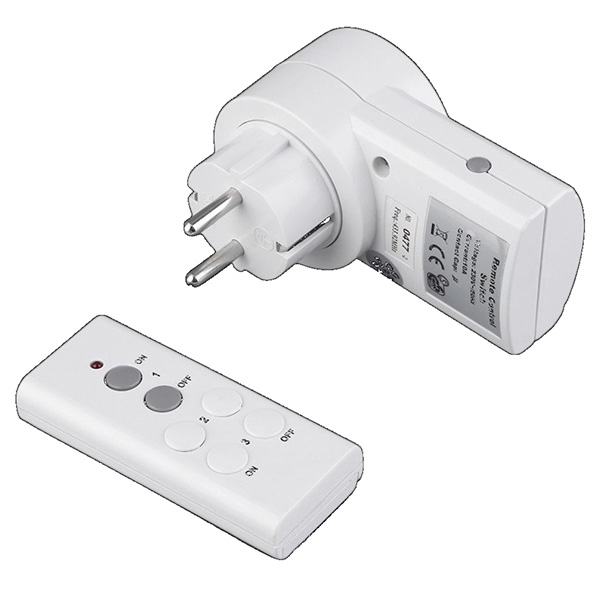 Conjunto de dos receptores (enchufes) y emisor (mando a distancia). Base de enchufe con toma de tierra enchufable directamente a la red (230V), admite una potencia de hasta 2300W. Mando a distancia para encender/apagar los aparatos enchufados en cada uno de los enchufes. El mando funciona con una pila tipo 23A de 12V (incluida). Alcance efectivo de unos 30m. No requiere instalación, listo para usar. Ideal para controlar electrodomésticos díficiles de alcanzar.