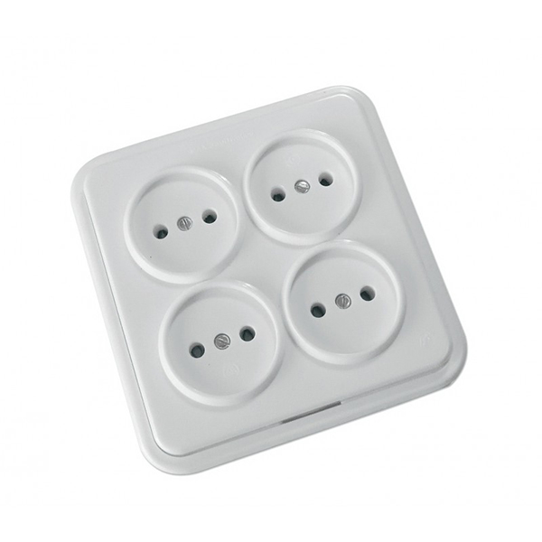 Base de cuatro enchufes sin toma de tierra para superficie, en formato cuadrado, de color blanco.