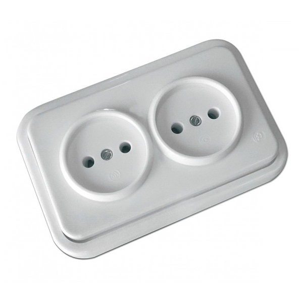 Base de dos enchufes sin toma de tierra para superficie, de color blanco.