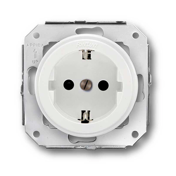 Enchufe con toma de tierra para instalación empotrada en cajetín universal (redondo o cuadrado). Cubierta de plástico en color blanco. Mecanismo interno de material termo resistivo con obturador para protección infantil. Con protección toma de tierra (T.T.) Acepta clavijas con espigas de 4,8mm (Schucko).