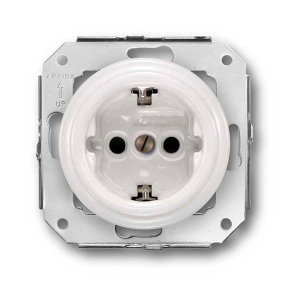 Enchufe con toma de tierra fabricado en porcelana blanca. Para instalación empotrada en cajetín universal (redondo o cuadrado). Replica de los tradicionales enchufes, ideales para decoraciones rústicas.