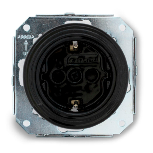 Enchufe con toma de tierra fabricado en porcelana negra. Para instalación empotrada en cajetín universal (redondo o cuadrado).