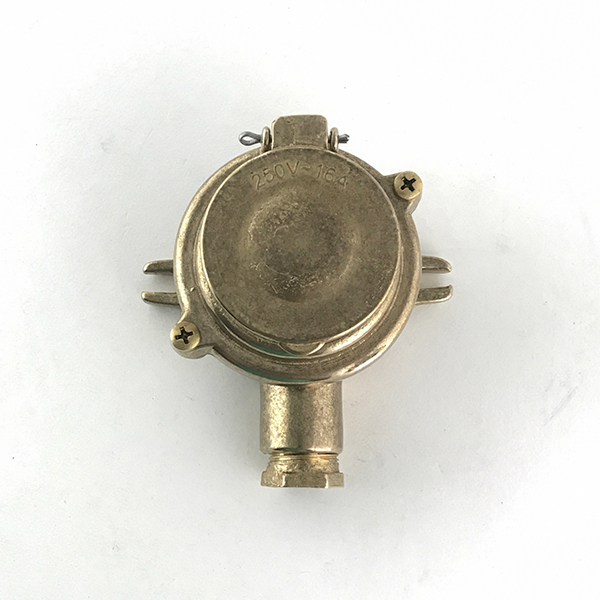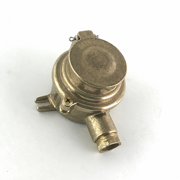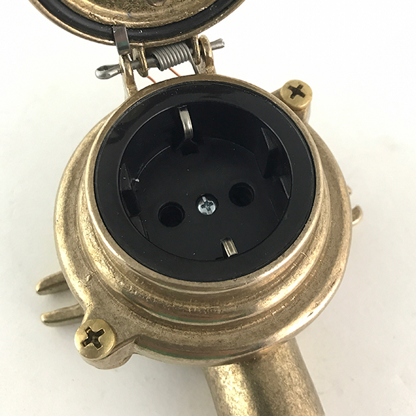 Espectacular enchufe de aspecto industrial, fabricado en latón. Para instalación en superficie. Con tapa abatible. Tiene una entrada para tubo y unos anclajes laterales para atornillarlo.