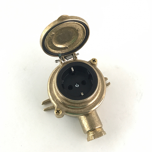 Espectacular enchufe de aspecto industrial, fabricado en latón. Para instalación en superficie. Con tapa abatible. Tiene una entrada para tubo y unos anclajes laterales para atornillarlo.