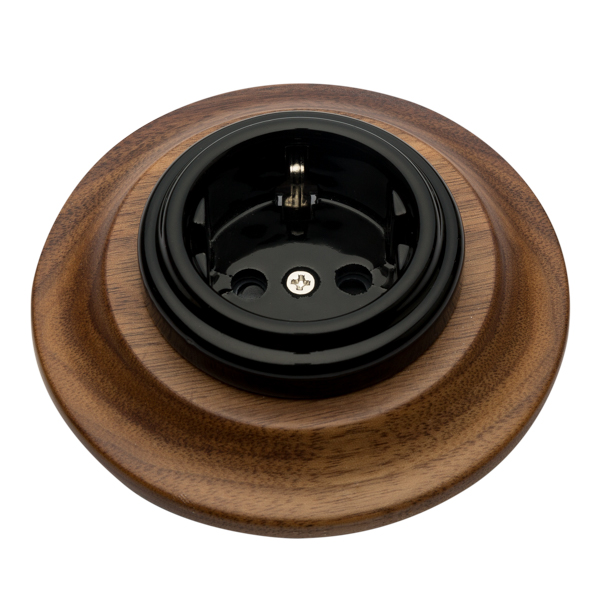 Base de enchufe fabricado en porcelana negra con marco de madera nogal americano para instalación empotrada.