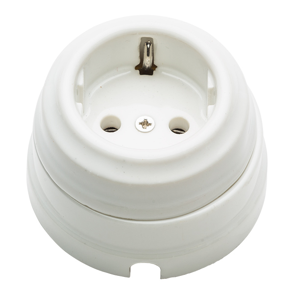 Original diseño, replica de los antiguos enchufes de porcelana pero cumpliendo las actuales normativas de seguridad. Evocan ambientes rústicos. Encajan perfectamente en instalaciones retro. Acepta todo tipo de clavijas (finas y gruesas con T.T.). Instalación en superficie. Fabricado en porcelana de color blanca. Esta formado por dos cuerpos, un aro de porcelana y la carátula del enchufe, también de porcelana, todo en color blanco.