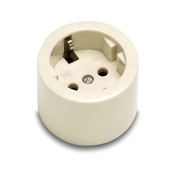 Base de enchufe redonda con toma de tierra para superficie. Mecanismo interior muy reforzado, de porcelana. Soporta 4000W. Acepta clavijas finas y gruesas (schuko)