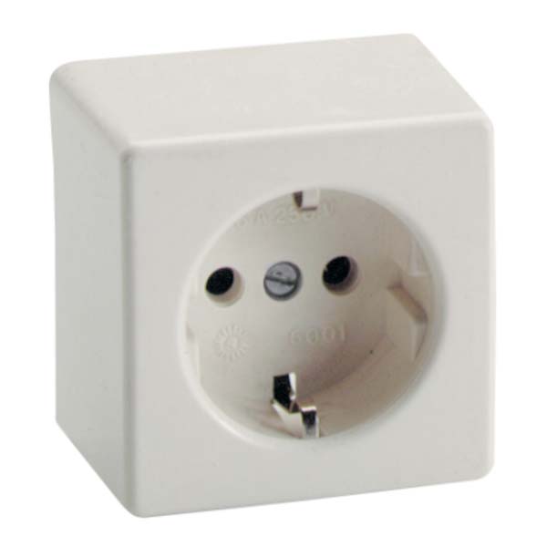 Enchufe cuadrado para instalaciones de superficie (sobrepuesto). Con Toma de Tierra (T.T.). Acepta clavijas de espigas finas y gruesas (schucko).