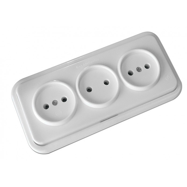 Base de tres enchufes sin toma de tierra para superficie, de color blanco.