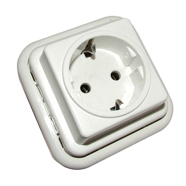 Base de enchufe con toma de tierra para superficie, de color blanco.