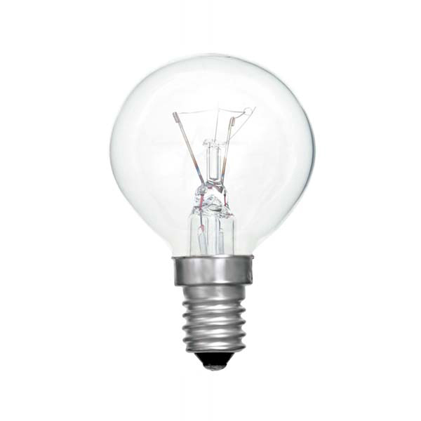 Bombilla incandescente (de filamento). Esférica de 25W con cristal transparente. De rosca fina (E-14)
