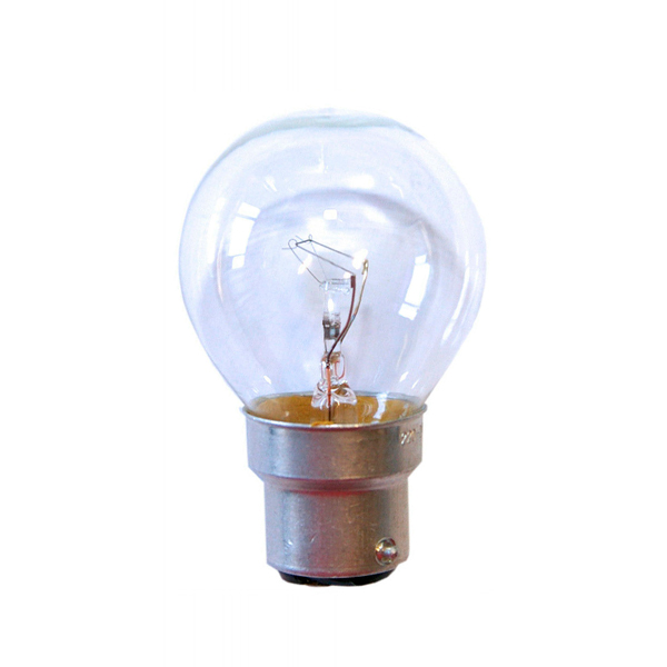Bombilla incandescente (de filamento). Formato esférica de 40W con cristal transparente. De rosca tipo bayoneta (B22). Rosca usada en Francia, Inglaterra y en algunas lámparas antiguas.